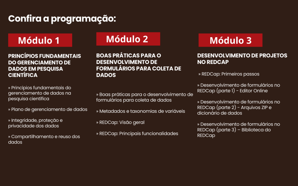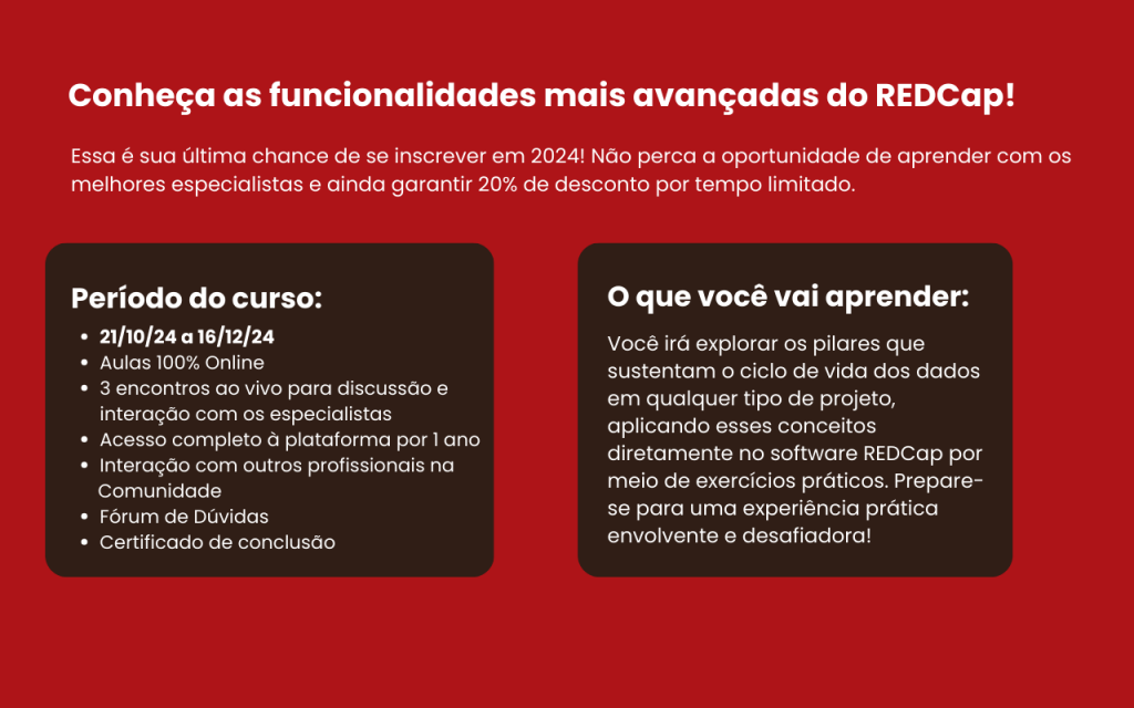 Desconto especial para grupos a partir de 5 pessoas! Fale conosco: cursos@redcapbrasil.com.br